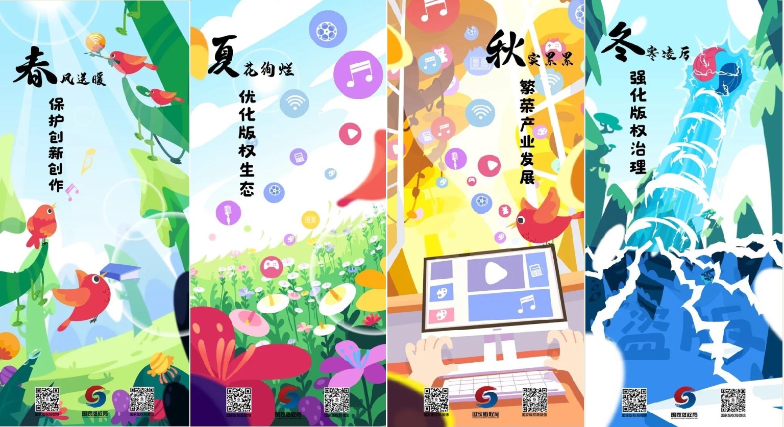為貫徹落實(shí)黨中央、國(guó)務(wù)院關(guān)于加強(qiáng)知識(shí)產(chǎn)權(quán)工作的決策部署,慶祝第20個(gè)世界知識(shí)產(chǎn)權(quán)日,做好2020年全國(guó)知識(shí)產(chǎn)權(quán)宣傳周相關(guān)工作,國(guó)家版權(quán)局自2020年4月中旬起集中開(kāi)展版權(quán)宣傳活動(dòng),并以4月20日至4月27日為重點(diǎn)宣傳時(shí)段。國(guó)家版權(quán)局圍繞“強(qiáng)化版權(quán)治理,優(yōu)化版權(quán)生態(tài)”主題,制作了4幅公益海報(bào),歡迎廣泛轉(zhuǎn)載傳播使用。國(guó)家版權(quán)局享有上述公益海報(bào)的全部版權(quán),請(qǐng)按照一套四張的排列次序原樣使用?!?/span>