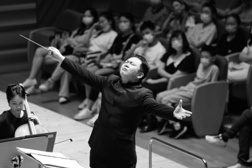 指揮家張櫓指揮演奏本次版權(quán)開(kāi)放作品《我們一起奔向大海仰望星空》現(xiàn)場(chǎng)。